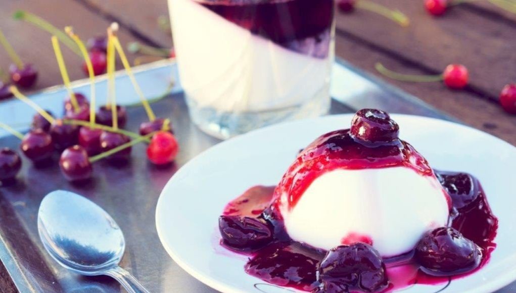 Желатин замочить стаканом горячей воды. Вишню разморозить. После того как желатин набухнет, смешать его с молоком, на маленьком огне помешивая до полного растворения желатина. Смешать подсластитель, творог, желатин с молоком. На дно формы положить фрукты, ягоды. Залить получившуюся смесь в форму. Поставить в холодильник на 3-4 часа или на ночь.