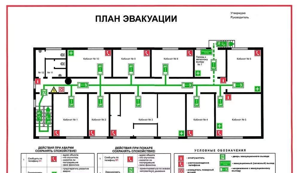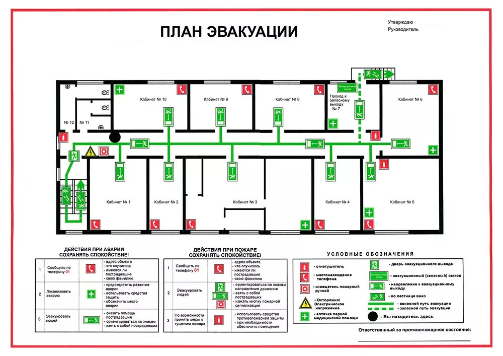 План эвакуации — официальный документ, определяющий порядок, пути и выходы людей из сооружения при пожаре или другом чрезвычайном происшествии (ЧП). Плюс к этому, в нем указаны правила поведения, а также очередность действий персонала. От того, насколько правильно и детально он составлен, зависит не только здоровье людей и сохранность имущества, но и эффективность ликвидации аварийной ситуации.