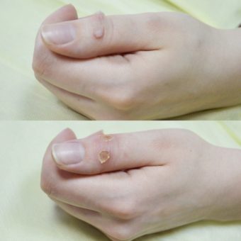 После удаления на месте бородавки остается воронкообразная рана. Она может быть размеров как в несколько миллиметров, так и в пару сантиметров. В первые дни после удаления она покроется корочкой. Со временем эта корочка отпадет сама, а под ней уже будет новая кожа. После того как отпала корочка, углубление тоже довольно быстро зарастет. Сразу после удаления, в области ранки может возникнуть небольшая отечность и покраснение. Они могут продержаться несколько суток. Пугаться этого не стоит, это лишь реакция тканей на полученную травму.