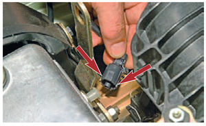 · Сжатием фиксаторов отсоединяют клемму питания и провода от датчика.