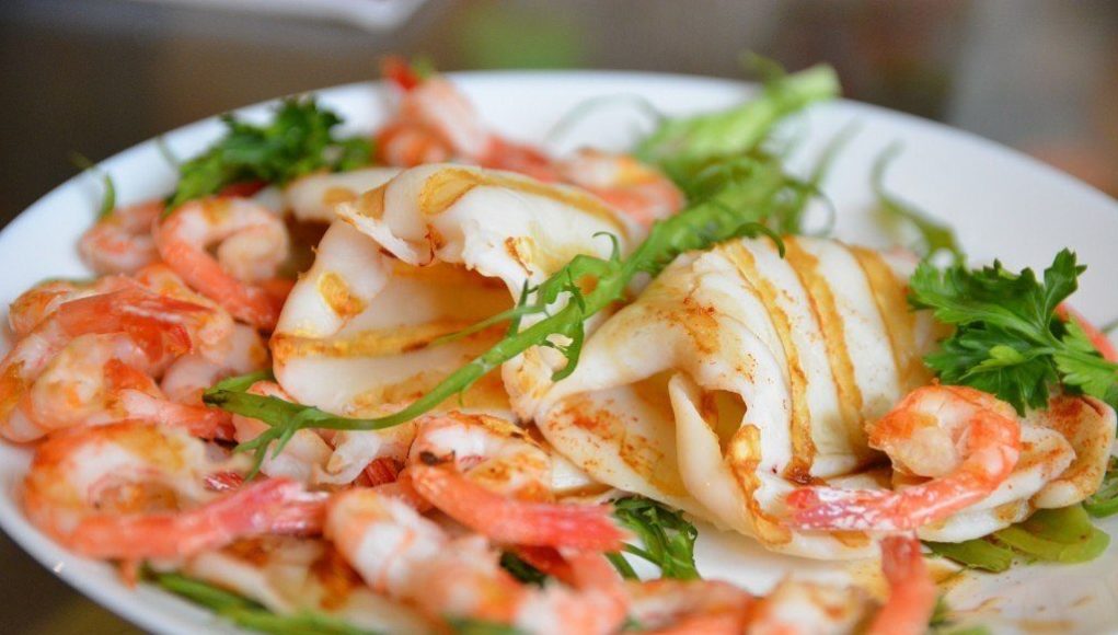 Кальмар почистить , промыть , обсушить, креветки очистить от панциря, разогреть гриль (у меня электро) до 200 градусов , положить кальмар и креветки и жарить минуты 2-3 . солить не надо, вкус морепродуктов получается непередаваемый , добавить зелень.