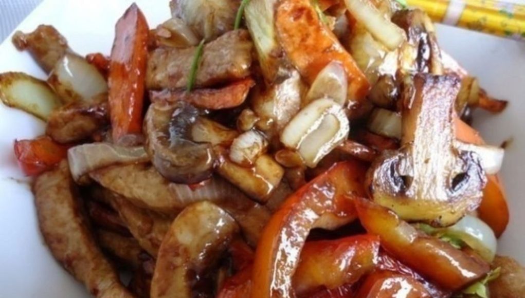 В раскалённом воке на большом огне на быстро обжарьте в течение пары минут подготовленное мясо. Мясо в сковороду кладем порциями , что бы при выделении сока оно успело прожариться до появления золотистой корочки, а не тушиться. Овощи так же жарим порциями, пусть они останутся хрустящими и сочными внутри и сохранят свой яркий цвет.Овощи должны получиться так скажем на зубок.
