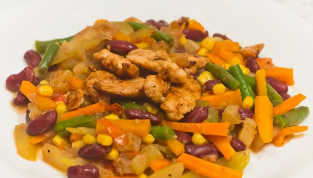 кабачок нарезать соломкой,тушить, добавить фасоль стручковую и красную,кукурузу