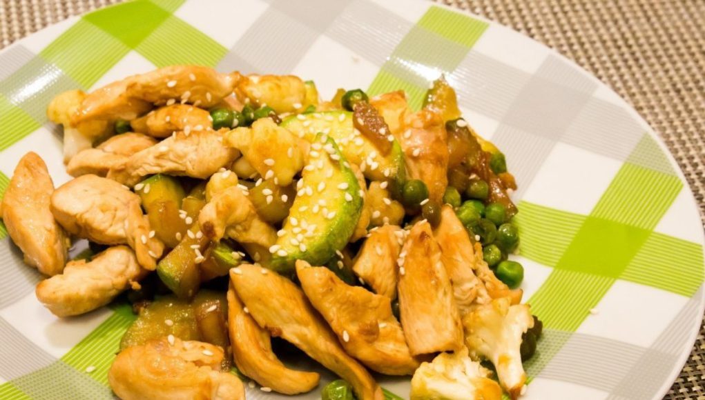 Нарезать грудку . Жарить без масла несколько минут. Затем добавить нарезанный кабачок и горошек. Тушить еще 5-7 минут. Добавить соевый соус и специи. Посыпать кунжутом. Готовить еще пару минут.