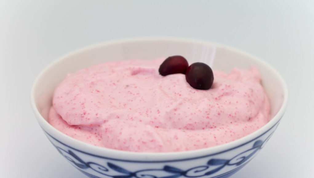 Потолочь клюкву и отжать сок. Выжимки залить водой и варить 3 — 5 минут. Отвар процедить, добавить сахарный песок и довести до кипения. Манную крупу развести полученным соком клюквы, влить в кипящий отвар и варить до загустения. Горячую кашу выложить на противень, дать остыть и нарезать кусочками. Подавать с клюквенным или фруктовым сиропом.