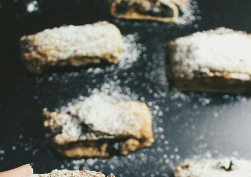 Выкладываем на всю поверхность начинку и сворачиваем в рулет.