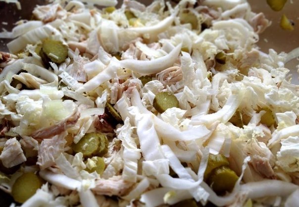 Для приготовления салата необходимо отварить куриное мясо и разобрать его на волокна или порезать кубиками или дольками. Хорошо подойдет для этого куриная грудка на кости без кожи или филе.