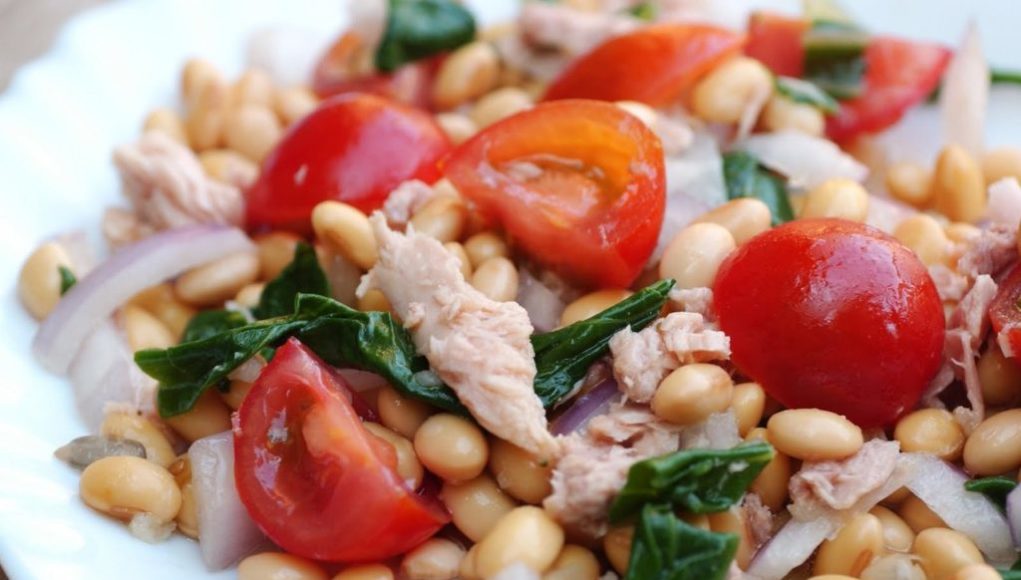 Смешать все ингредиенты, заправить йогуртом, перцем и соком от тунца.