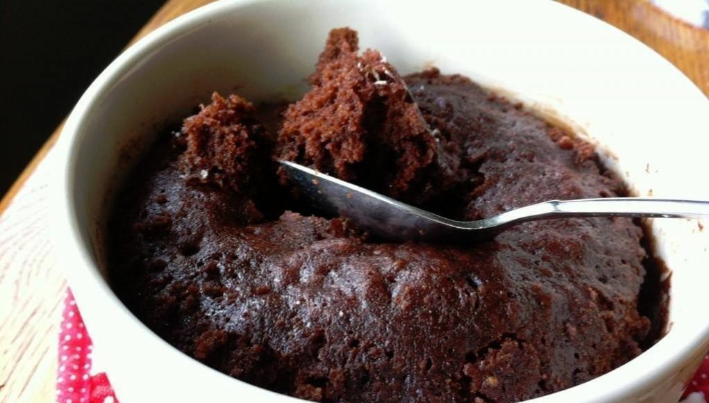 Все ингредиенты смешать, вылить в чашку, смазанную маслом и выпекать в микроволновой печи на максимальной мощности около 2 минут.