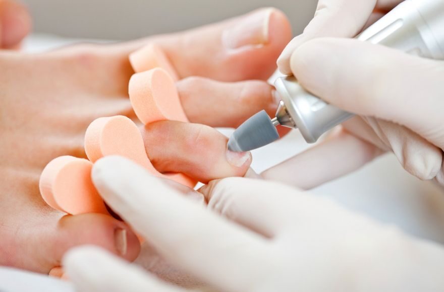 - Осуществляется процесс обработки стоп и пальцев. Причем, данный процесс выполняется без применения распаривания или же водных процедур. Все делается на сухую кожу;