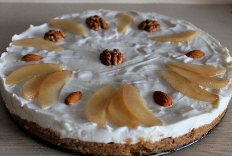 3) Выкладываем крем на основу, сверху можно украсить кусочками груши, орехами или ягодами.