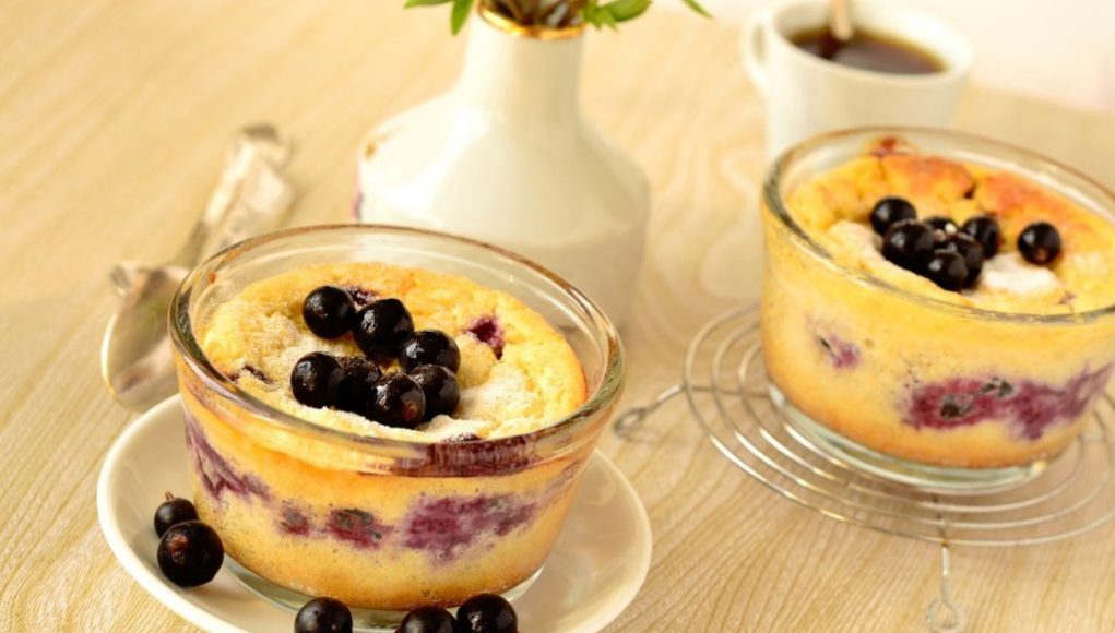 В блендере взбить творог, яйцо, манку, подсластитель, добавить порезанный на кружочки банан и черную смородину. Вылить массу в форму для микроволновой печи, например в кружку или в пластиковый контейнер, готовить 5-7 минут на максимальной мощности.
