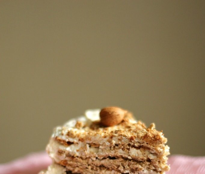 Для крема, творог вместе с бананом и йогуртом перетереть блендером, добавить ванилин, ром и мед по желанию. Промазать каждый корж кремом и оставить в холодильнике на ночь.
