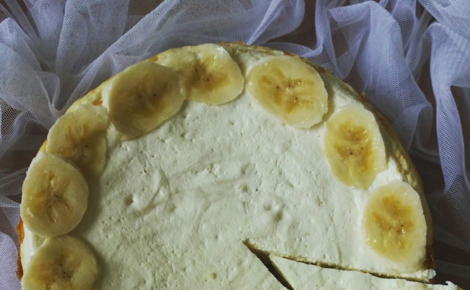 Банан размять в пюре, все смешать до однородной массы. Выложить на пергамент, сформировать корж с бортиками и выпекать (я выпекала в мультиварке на режиме «выпечка» 15 минут).
