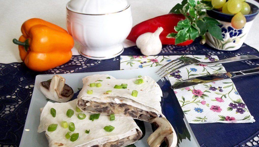 Шампиньоны помойте, высушите и нашинкуйте соломкой. По желанию можете предварительно очистить их шляпки. Однако, это вовсе не обязательно, достаточно будет хорошо их вымыть. Сковороду с маслом нагрейте и отправьте жариться грибы. Во время жарки они будут много выделять жидкости. Ее можно собрать в стакан, а потом влить обратно, когда будете грибы тушить.Репчатый лук очистите, помойте, нарежьте кубиками и отправьте жариться к грибам. Приправьте грибы солью, черным молотым перцем и жарьте почти до готовности. Сыр натрите на терке или мелко нарежьте кубиками. После отправьте сыр к грибам, также влейте йогурт, и грибной сок, который собирали во время жарки шампиньонов. Продукты все перемешайте, сковороду закройте крышкой и оставьте на плите до полного расплавления сыра. Лаваш расстелите на столе и на один его край выложите грибную начинку. Лаваш заверните конвертом, оберните пищевой пленкой и оставьте пропитываться на 1 час. Если закуску подать сразу, то лаваш будет сухим, от чего он может разворачиваться и не держать заданную форму. Перед подачей, с лаваша снимите пленку, нарежьте его кусочками. По желанию можно жюльен немного подогреть в микроволновой печи.